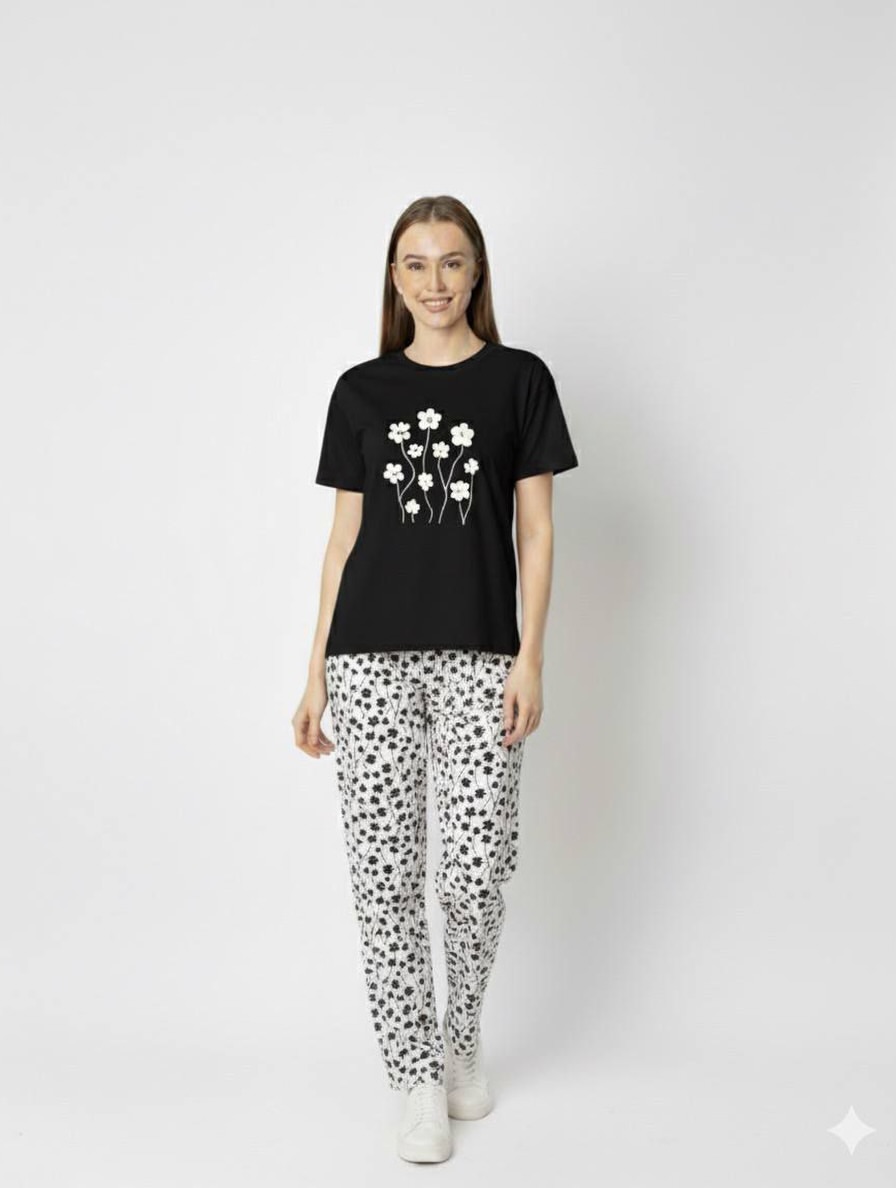 اندازه ها: اندازه های تیشرت👈🏻قد تیشرت ۶۸ سانت /دور سینه ۱۰۰ سانت/قد آستین از کنار یقه ۳۲ سانت/اندازه های شلوار👈🏻قد شلوار ۹۵ سانت/قد فاق ۳۳ سانت/دور یک ران از زیر فاق ۶۰ سانت/دور کمر ۶۰ سانت تا ۱۱۰ سانت